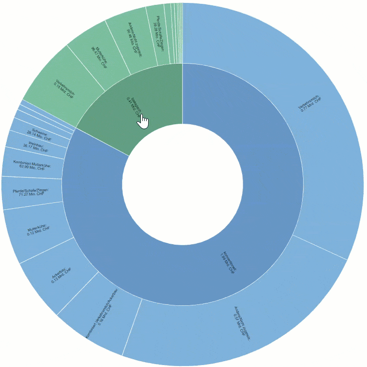 Die Daten stammen vom Bundesamt für Landwirtschaft (BLW) und können in Rohform hier heruntergeladen werden. Für die Darstellungen wurden die Daten aufbereitet. Für den Zoomable Sunburst wurde dies mithilfe eines Python-Skripts erledigt (siehe Github-Repository).